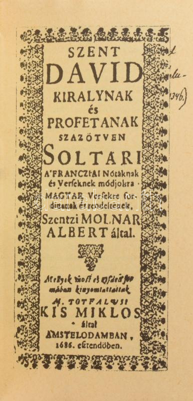 Szenczi Molnár Albert: Dávid Zsoltárok. (Szent Dávid királynak és prófétának százötven Soltári). Bp., 1985, Helikon Kiadó. Reprint kiadás,, kÃsérÅ‘füzettel. A Tótfalusi Kis Miklós által 1686-ban Amszterdamban kiadott, az Egyetemi Könyvtár Régi Könyvek Tárában Å‘rzött RMK I. 308/I. jelzetű kiadvány hasonmása. Kiadói aranyozott műbÅ‘r-kötés, 11 cm