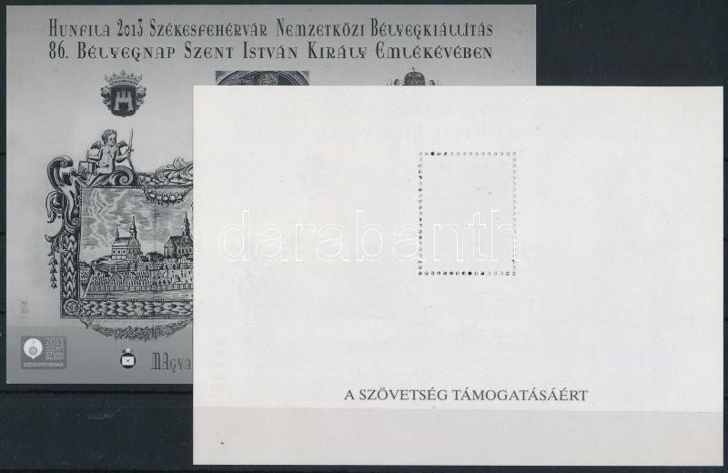 2013 Hunfila Székesfehérvár Nemzetközi Bélyegkiállítás 86. Bélyegnap Szent István király emlékévében 2 db feketenyomat emlékív "A SZÖVETSÉG TÁMOGATÁSÁÉRT" hátoldali felirattal