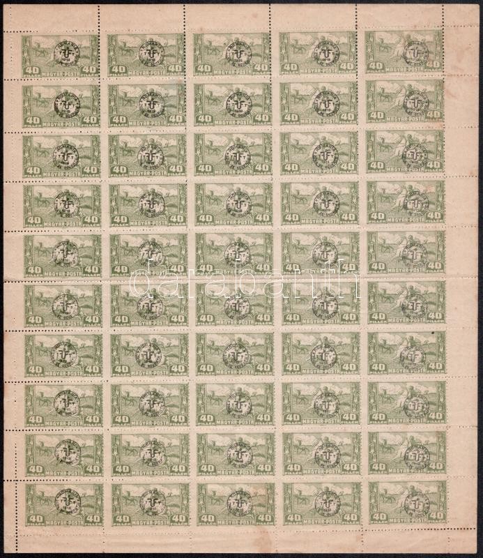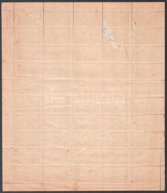 Debrecen II. 1920 40f hajtott teljes ív, III. osztályú (rozsdafoltok, papír elvékonyodás, csúnya betapadás, törések) / Mi 87 x folded complete sheet. Signed: Bodor (stain, thin paper, gum disturbance, folds, creases)