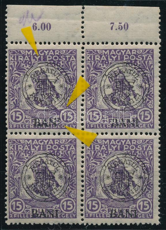Leírás: Nagyvárad 1919 Hadisegély 15f ívszéli 4-es tömb lemezhibákkal, Bodor vizsgálójellel