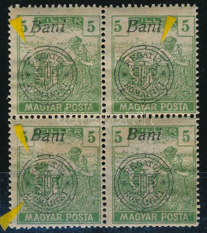 Leírás: Nagyvárad 1919 Magyar Posta 5f négyestömb, három bélyeg hiányos felülnyomattal, Bodor vizsgálójellel (gumihiba / gum disturbance)