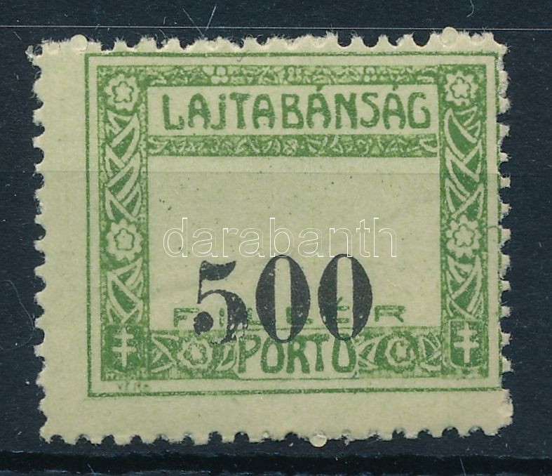 Leírás: Nyugat-Magyarország VII. 1921 Portó 500f elcsúszott értékszámmal és papírránccal, Bodor vizsgálójellel