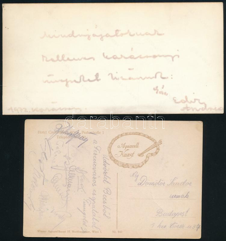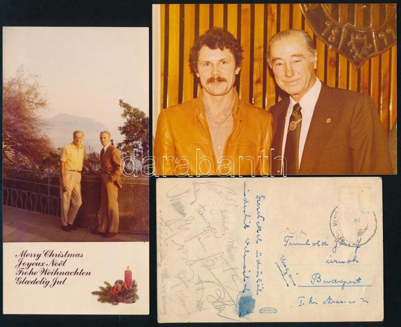 Leírás: Toldi Géza (1909-1985) labdarúgót ábrázoló fotók, pl. Farkas Bertalannal és saját kézzel aláírt lapok