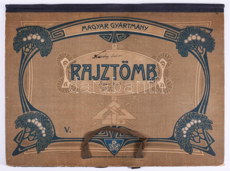 Leírás: cca 1920 Rigler József Ede Papírneműgyár R.T. rajztömb mappa, szecessziós díszítéssel, sérülésekkel, tulajdonosi feljegyzésekkel, 31x40,5 cm