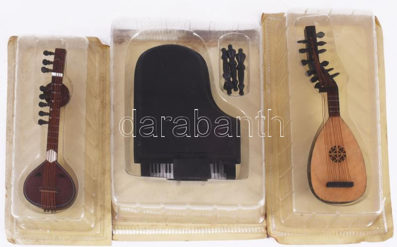 Leírás: 3 db mini hangszer, eredeti dobozában: szitár, piorba, zongora Kb 12 cm