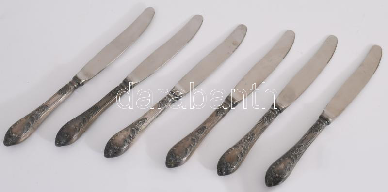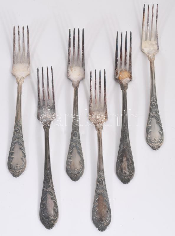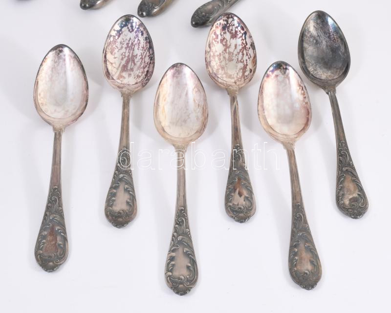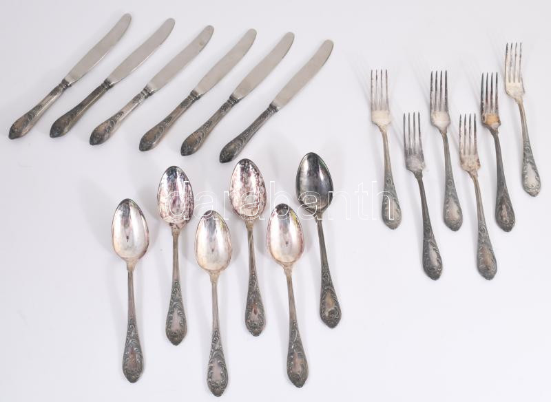 Leírás: 6 személyes, 18 részes ezüstözött orosz evőeszköz készlet, jelzett.