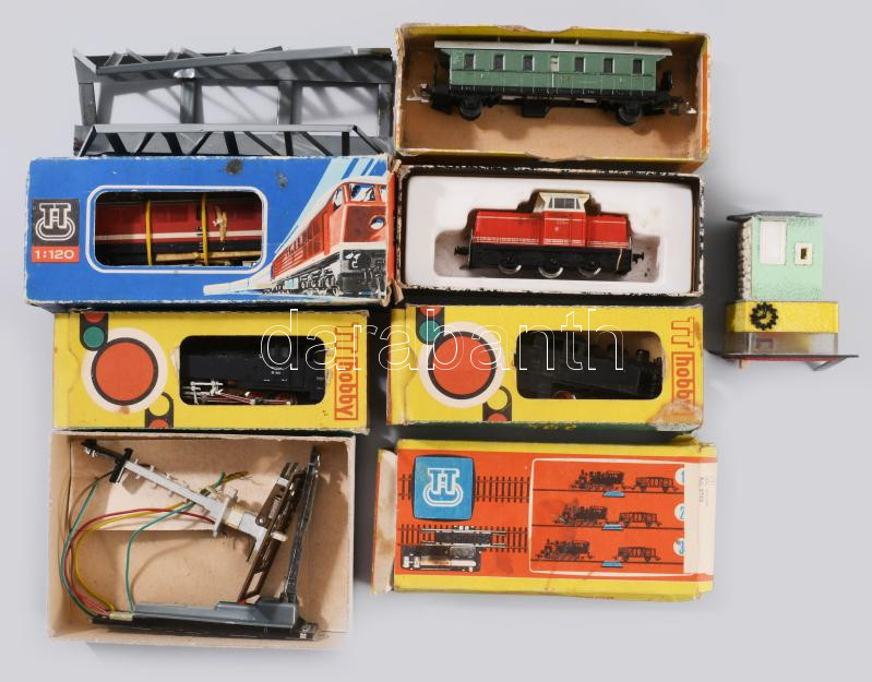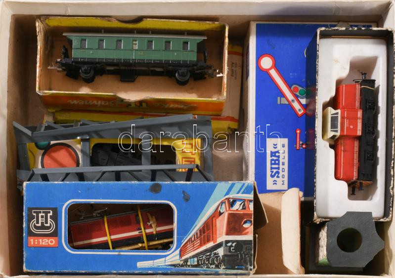 Leírás: Kis doboznyi modellvasút tétel, közte mozdonyok, kiegészítők.