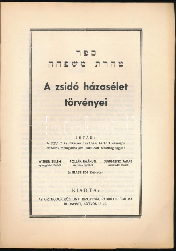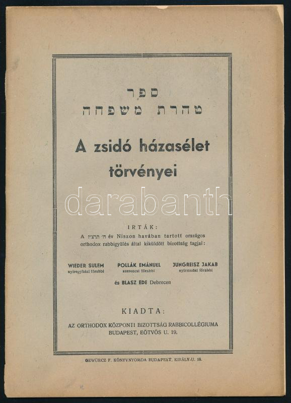 Wieder Sulem - Pollák Emánuel - Jungreisz Jakab - Blasz Ede: A zsidó h... https://www.darabanth.com/hu/512-Gyorsarveres/512.0/Mutargy-papirregiseg-egyeb/Judaika~657/Wieder-Sulem-Pollak-Emanuel-Jungreisz-Jakab-Blasz-Ede-A-zsido-hazaselet-torvenyei-Bp~II3463754