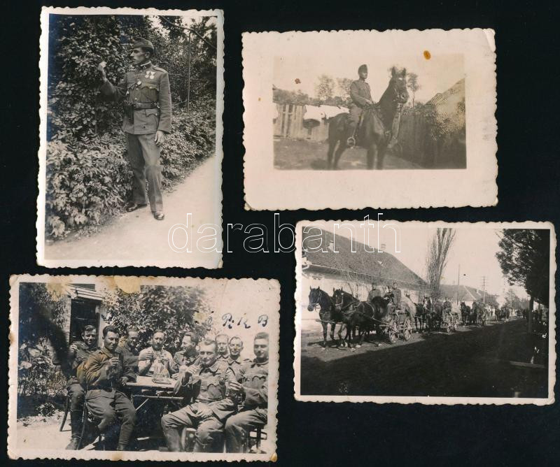 Leírás: II. világháborús katonai fotók, egyiken a feleség viseli a katonaruhát, 10 db, felületi sérülésekkel, 8,5×6 cm