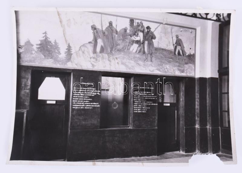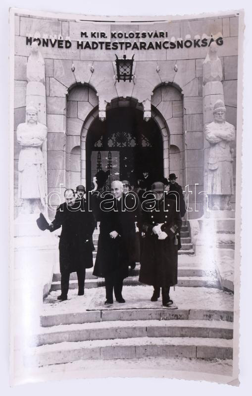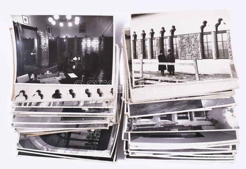 cca 1942 Kolozsvár, a M. Kir. Honvéd Hadtestparancsnokság épületét ábrázoló felvételek (külsÅ‘ homlokzat, belsÅ‘ terek, stb.), összesen 45 db fotó, részben pecséttel jelzettek, változó állapotban, többségükön albumba ragasztás nyomaival, 12,5x17,5 cm körüli méretben. (Az eredetileg román középiskolának tervezett épületet 1939-ben Rátz Mihály tervei alapján kezdték el épÃteni; a második bécsi döntés után 1941. márciusától Ormay János épÃtészmérnök fÅ‘hadnagy tervezte át a befejezetlen épületet, melyet végül 1942. január 18-án, Bárdossy László miniszterelnök és Bánffy Dániel földművelésügyi miniszter jelenlétében avattak fel.)