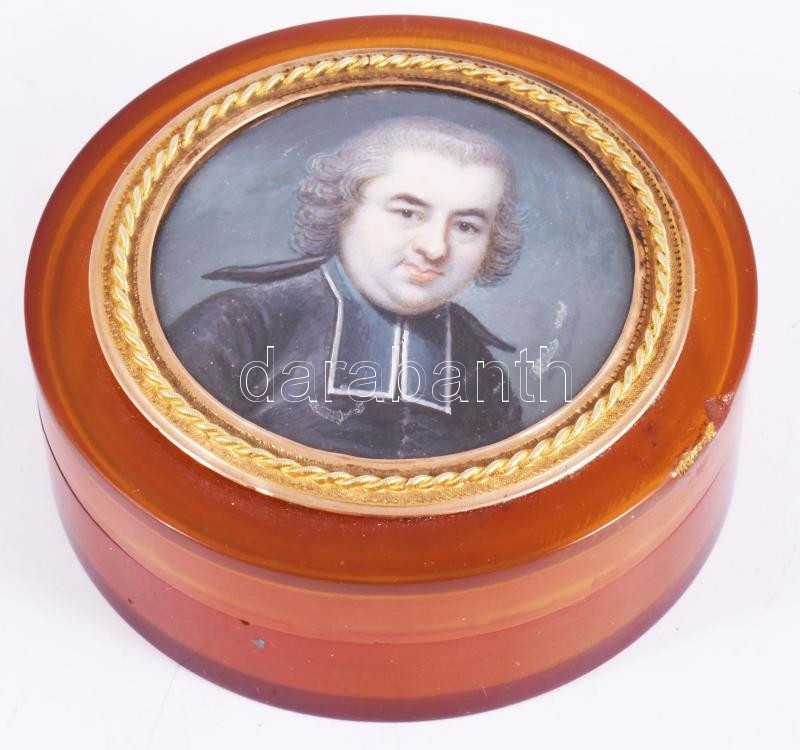Leírás: Antik szelence, festett miniatúrával a fedelén, sérüléssel, d: 7 cm