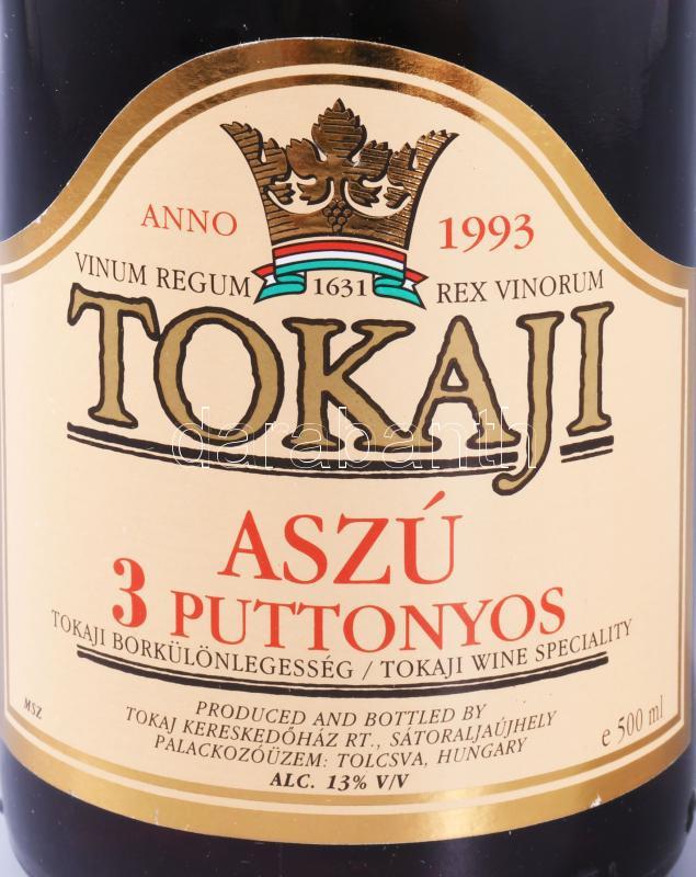 1993, 6 darab Tokaji aszú, 3 puttonyos, Tolcsva, 13%, 0,5l, bontatlan,... https://www.darabanth.com/hu/512-Gyorsarveres/512.0/Mutargy-papirregiseg-egyeb/Muzealis-borok-italok~584/1993-6-darab-Tokaji-aszu-3-puttonyos-Tolcsva-13-0-5l-bontatlan-eredeti-dobozaban~II3461178