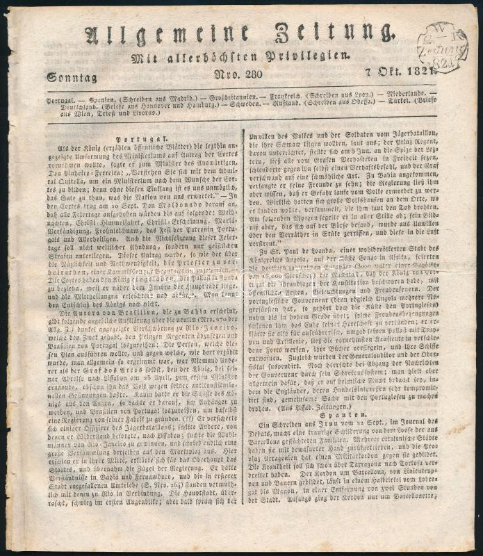 1821-1828 Allgemeine Zeitung c. német nyelvű hírlap 2 db száma, szigne... https://www.darabanth.com/hu/512-Gyorsarveres/512.0/Mutargy-papirregiseg-egyeb/Nyomtatvanyok~688/1821-1828-Allgemeine-Zeitung-c-nemet-nyelvu-hirlap-2-db-szama-szignettaval~II3460368
