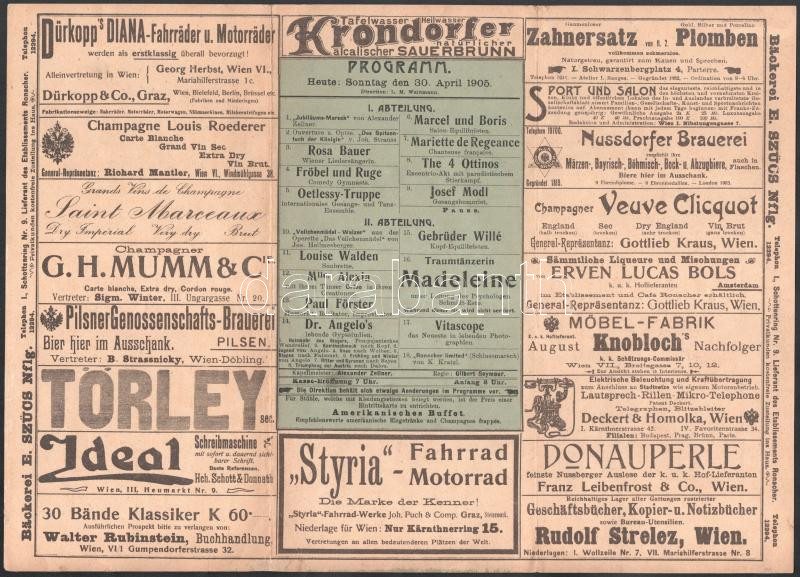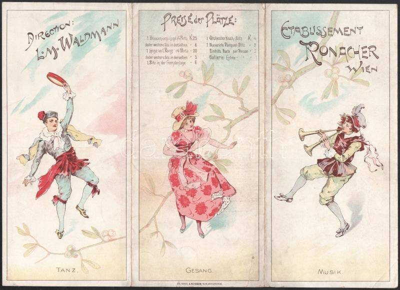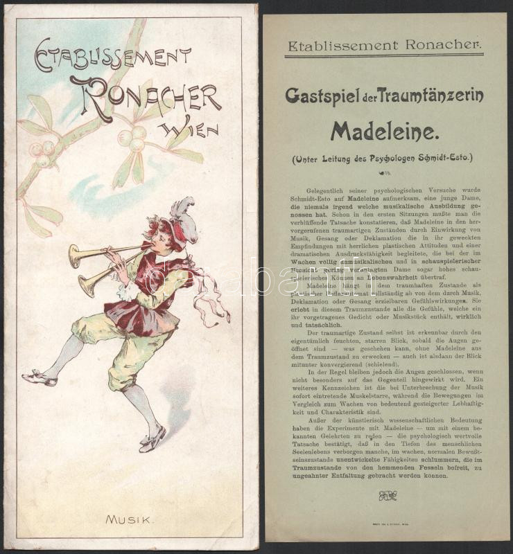 1905 Etablissement Ronacher Wien (Bécs), dekoratív szecessziós litho háromrészes műsoros kartonlap reklámokkal, árakkal, külön lapon, Madeleine az álomtáncos, 26,5×35,5 cm