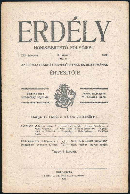 1912 Erdély. Honismertető folyóirat Az Erdélyi Kárpát-Egyesületnek és Muzeumának értesítőjének XXI. évf. 3. szám. Főszerk.: Szádeczky Lajos dr. Felelős szerk.: M. Kovács Géza. Kolozsvár, 1912.