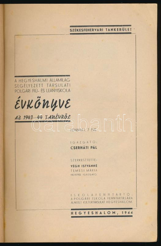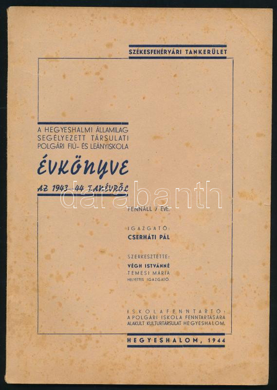 1944 A hegyeshalmi államilag segélyezett társulati polgári fiú- és leányiskola évkönyve az 1943-44. tanévről. (Mosonmagyaróvár, Mosonvármegye-ny.), 46+(2) p. Kiadói papírkötés, foltos borítóval.