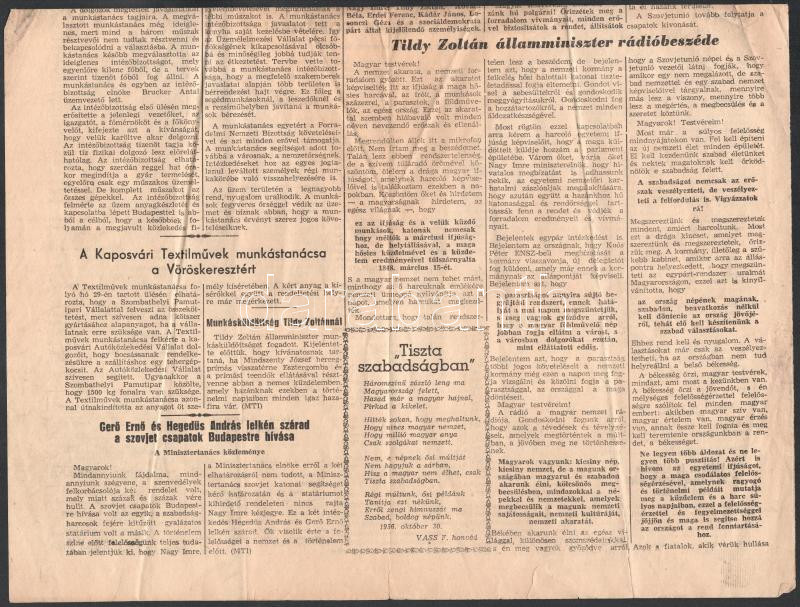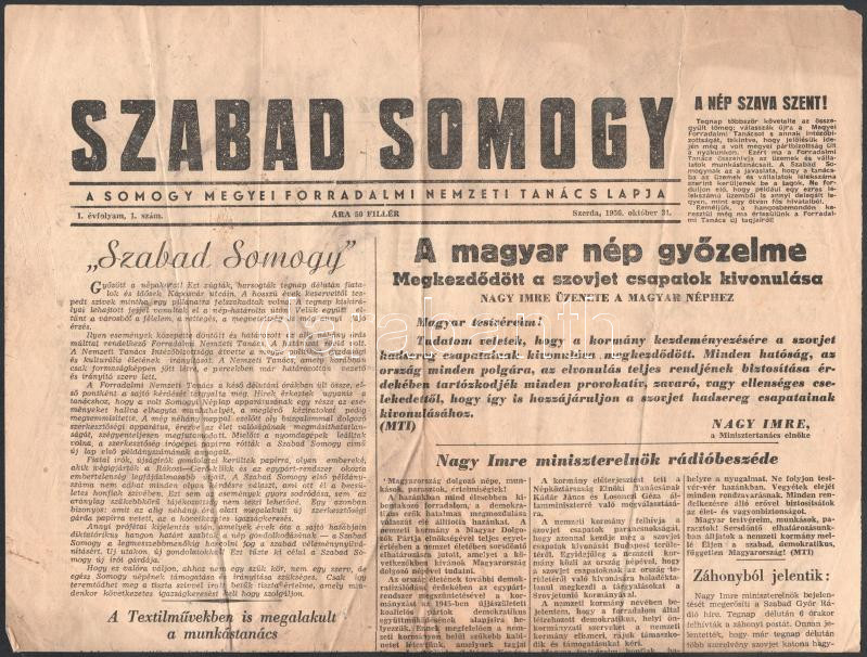 1956 Szabad Somogy, a Somogy Megyei Forradalmi Nemzeti Tanács lapja I. évf. 1. szám, 1956. október 31., benne a forradalom híreivel, kisebb szakadásokkal, 2 p.