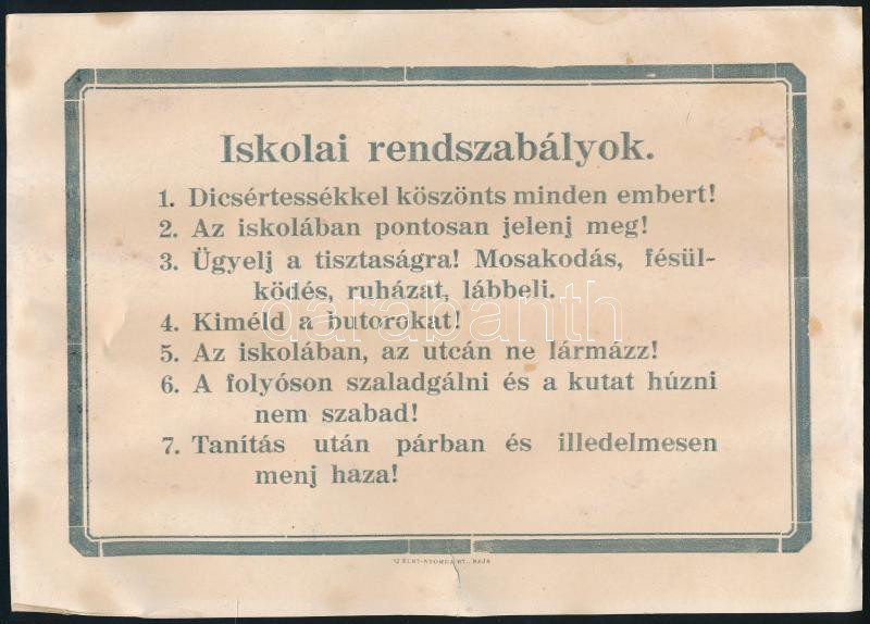 Leírás: cca 1925-1945 Iskolai rendszabályok. Baja, Uj Élet-ny., viseltes állapotban, kisebb lapszéli szakadással, 18x25 cm