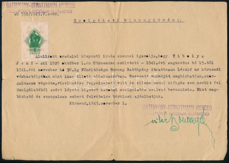 1943 Körmend, Batthyány-Strattmann herceg uradalmának központi irodája által kiállÃtott szolgálati bizonyÃtvány Batthyány-Strattmann László várkastélyában alkalmazásban állt inas részére, aláÃrással, 1P okmánybélyeggel