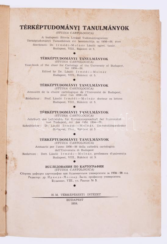 Leírás: Térképtudományi tanulmányok (Studia Cartologica). Bp., 1958, H.M. Térképészeti Intézet. Kiadói papírkötés, kopottas állapotban.