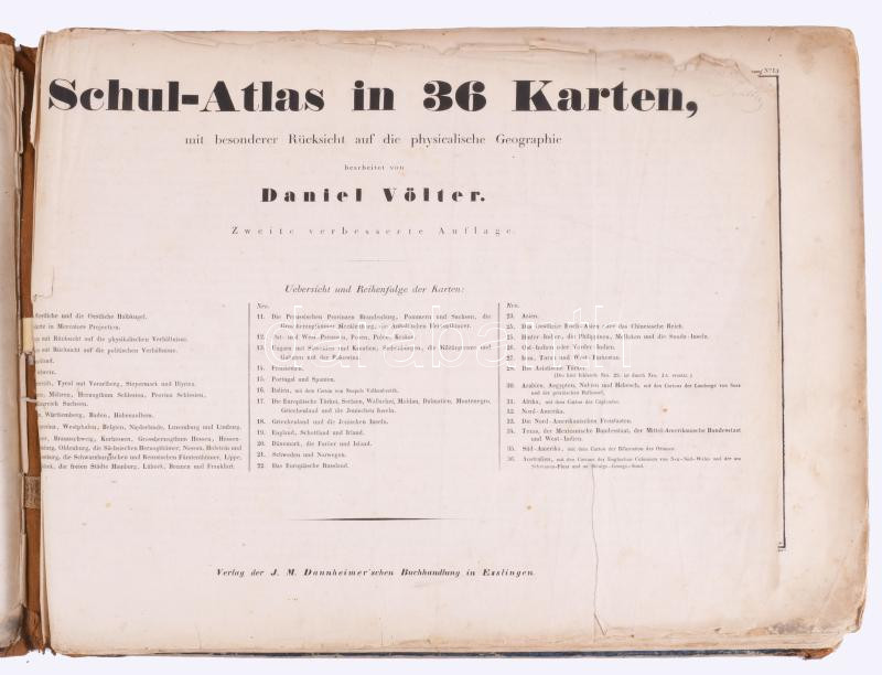 Völter, Daniel: Schul-Atlas in 36 Karten, mit besonderer Rücksicht auf die physicalische Geographie. Bearbeitet von - -. Esslingen,(1845.) ,Verlag der J. M. Dannheimer'schen Buchhandlung, 2 p.+1-6+9-13+7-8+IVc+19-25+14-18+26-38 t. Német nyelven.