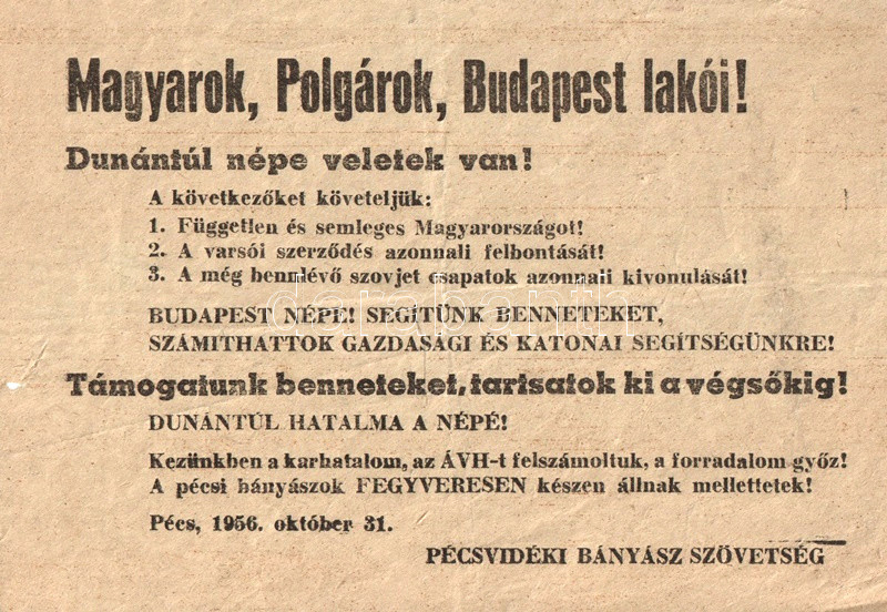 1956. október 31-én Pécsett kelt röpiratunk a pécsi bányászok támogatásáról biztosítja a kormányt. Hárompontos kiáltványukban a Varsói Szerződés felmondását, a szovjet csapatok kivonulását és az ország függetlenségét követelik. Pécs és Baranya nevében kijelentik, hogy a Dél-Dunántúlon a rákosista ÁVH-t felszámolták, a karhatalmat a bányászok gyakorolják, Budapestet pedig gazdasági és katonai értelemben is támogatni fogják.