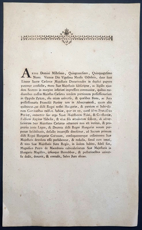Latin nyelvű oklevél-nyomtatványunk eredetije 1560 körül keletkezett. Az okmányban I. Ferdinánd magyar király az ország egyik jelentős méltóságának, Perényi Ferenc tárnokmesternek felségárulás miatti birtokfosztásáról rendelkezik. A korábban Habsburg-pártinak számító Perényi Ferenc főúr dokumentumunk szövege szerint 1559-ben elnyerte az Abaúj megyei Szikszó városát és további abaúji birtoktesteket. Ám a főúr még ebben az évben az erdélyi különállást képviselő Jagelló Izabella, valamint fia, János Zsigmond pártjára állt. A pártváltást az ellenérdekelt Habsburg-uralkodó - oklevelünk kiadója - főbenjáró bűnnek ítélte, és ennek nyomán dokumentumunk jogi aktusával megfosztotta Perényi Ferencet valamennyi birtokától, és annak birtokjogát örök időkre saját hívére, Macedóniai Péter kamarásmesternek és fiú ági örököseinek adományozta. Levéltári jelentőségű dokumentumunk a 220 évvel korábban kiadott felségárulási oklevél nyomán készült birtokjogi nyomtatvány.
