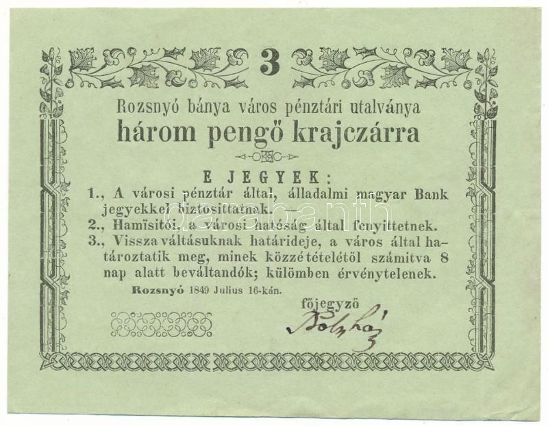 Leírás: 1849. Rozsnyó 1849. július 16. 3kr "Rozsnyó bánya város pénztári utalványa " T:F