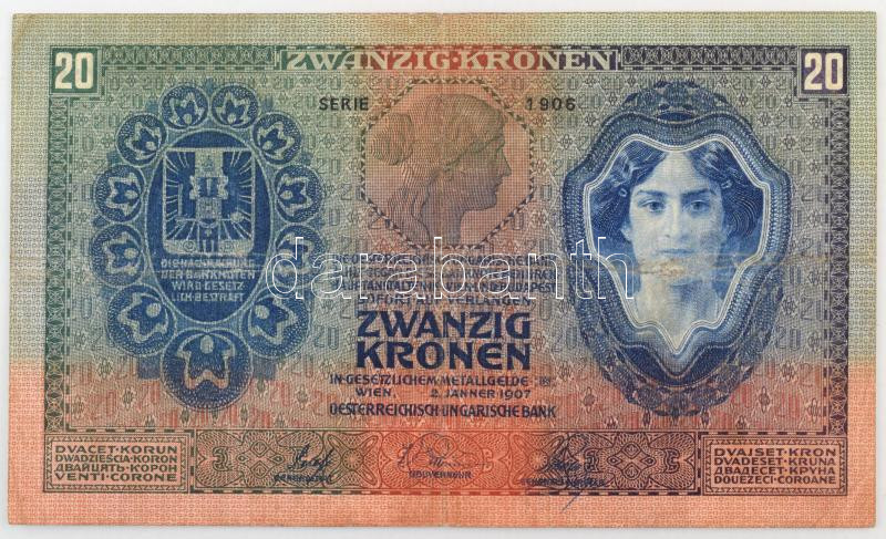 Hungary 1907. 20 Korona &quo... https://www.darabanth.com/hu/512-Gyorsarveres/512.0/Numizmatika/Magyar-bankjegyek~235/1907-20K-1906-073263-TF-VG3Cbr-3E-Hungary-1907-20-Korona-1906-073263-CF-VG3Cbr-3E-Adamo-K16~II3459121