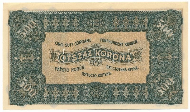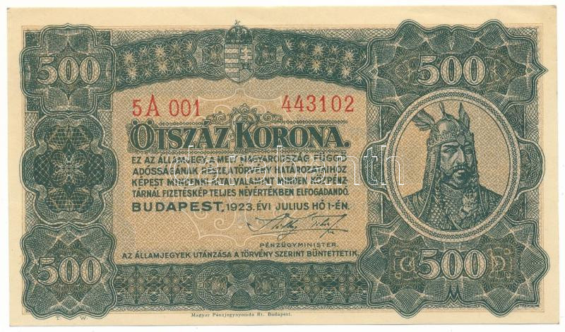 Leírás: 1923. 500K "Magyar Pénzjegynyomda Rt. Budapest." nyomdahely-jelöléssel "5A 443102" T:AU