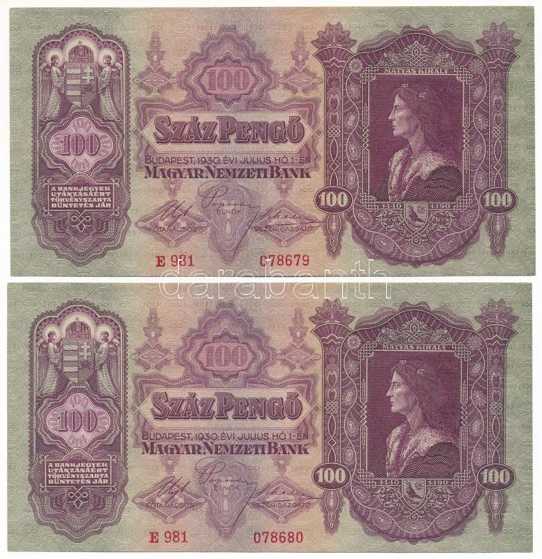 Leírás: 1930. 100P (2x) sorszámkövetők "E 981 078679 - E 981 078680" T:XF