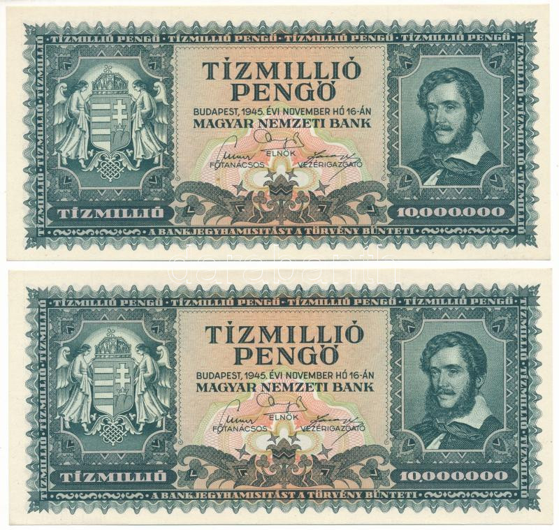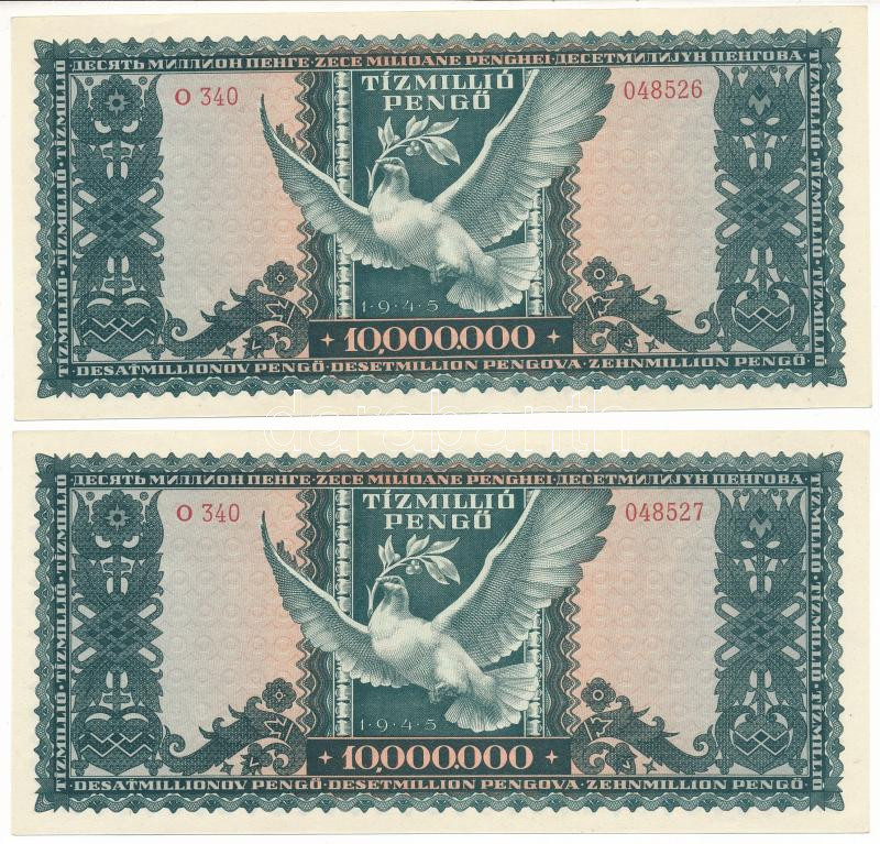 Leírás: 1945. 10.000.000P (2x) sorszámkövetők "O 340 048526 - O 340 048527" T:UNC,AU