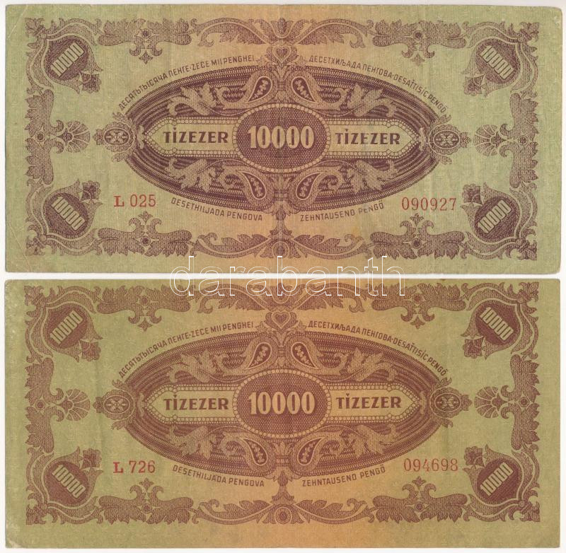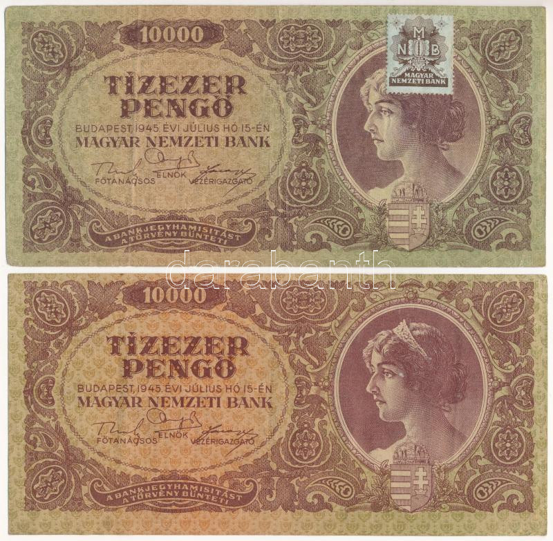 1945. 10.000P + 10.000P lemezhibás "MNB" bélyeggel T:F szép,... https://www.darabanth.com/hu/512-Gyorsarveres/512.0/Numizmatika/Magyar-bankjegyek~235/1945-10000P-plus-10000P-lemezhibas-MNB-belyeggel-TF-szep-eros-papir3Cbr-3E-Adamo-P23eh~II3464908