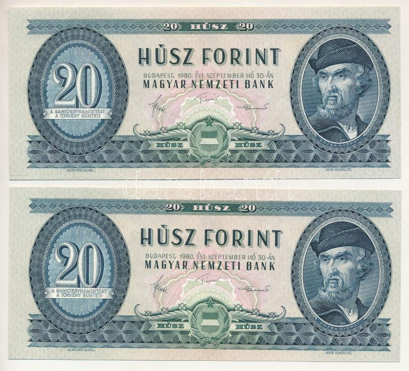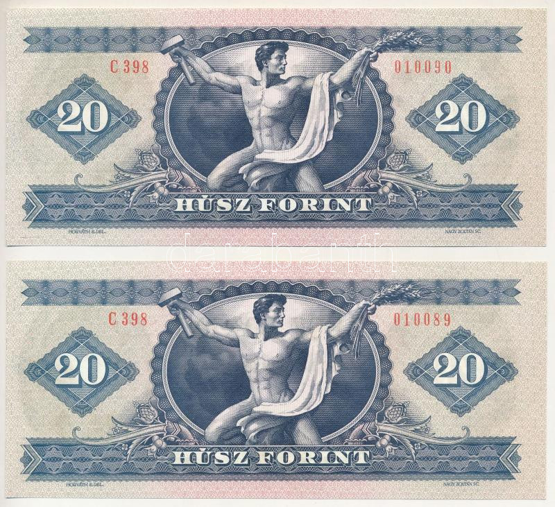 Leírás: 1980. 20Ft (2x) sorszámkövetők "C 398 010089 - C 398 010090" T:UNC hullámos papír