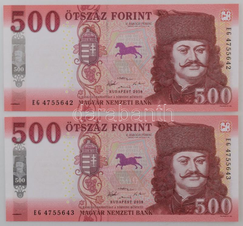 2018. 500Ft (2x) sorszámkövetők "EG 4755642 - EG 4755643" T:... https://www.darabanth.com/hu/512-Gyorsarveres/512.0/Numizmatika/Magyar-bankjegyek~235/2018-500Ft-2x-sorszamkovetok-EG-4755642-EG-4755643-TUNC-AU-hullamos-papir3Cbr-3E-Adamo~II3440723