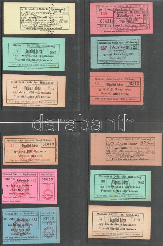 1908-1945. 139db-os izraelita (zsidó) hitközségek vágatási bárcáiból, utalványaiból, értékjegyeiből álló tétel mappában, Koronában, Pengőben (és Fillérben) meghatározott értékjegyek, benne: "Gabella-bárcza" (hitközségi adó), vágatási bárcák és jegyek, illetve értékjegyek súlyban meghatározott húsok után, illetve klf haszonállatok vágatásáról (liba/lúd, juh, csirke, tyúk, kakas, borjú, kacsa, pulyka). Bővebben: 1908-1942. "Miskolczi Ortodox Izraelita Hitközség/Anyahitközség" (118db) + "Miskolci Ortodox Izraelita Rabbiság" tréfo és koser kitöltetlen vágatási jegy (8db) + "Sátoraljaújhely Ortodox Izraelita Hitközség" vágatási bárca (10db) + 1945. "Miskolci Zsidók Szövetsége" kitöltetlen ebédutalvány + DN 2db utalvány, árakkal T:vegyes