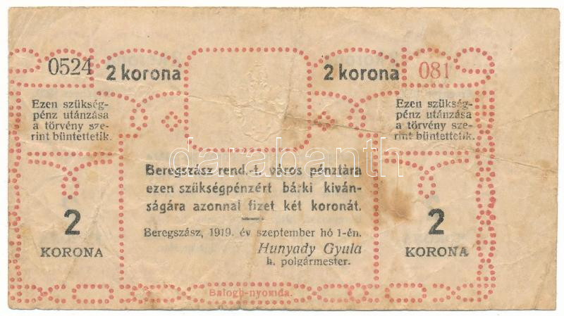 Adamo BER... https://www.darabanth.com/hu/512-Gyorsarveres/512.0/Numizmatika/Papir-es-fem-szuksegpenzek~234/1919-Beregszasz-2K-szuksegpenz-szarazpecsettel-TF-VG-folt3Cbr-3E-Adamo-BER-12~II3462703