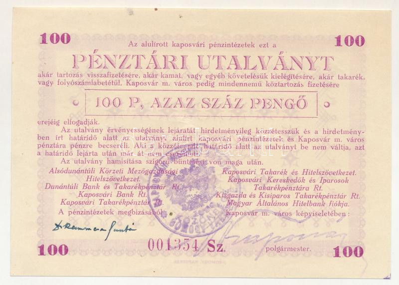 Leírás: 1945. Kaposvár 100P "Pénztári utalvány" tinta aláírással, bélyegzéssel, "035795" sorszámmal T:AU folt Adamo KAP-2.3.1
