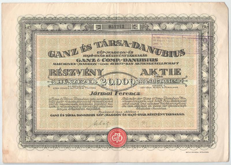 1923. Budapest "Ganz és Társa- Danubius Gép-, Waggon- és Hajó-Gyár Részvénytársaság" részvénye 20.000K-ról, magyar és német nyelven, szárazpecséttel, bélyegzésekkel és szelvényekkel T:F