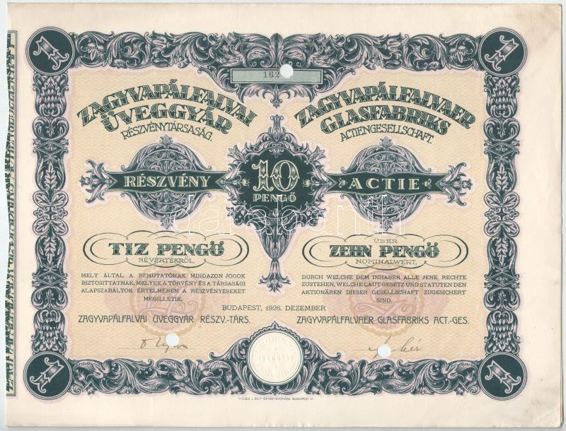 Leírás: 1926. Budapest "Zagyvapálfalvai Üveggyár Részvénytársaság " részvénye 10P-ről, szárazpecséttel, három lyukasztással érvénytelenítve T:AU
