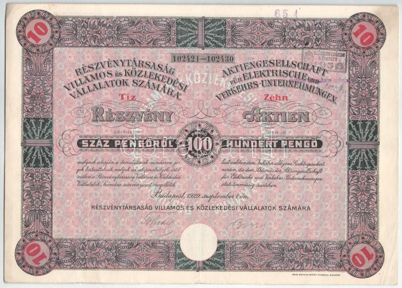 1929. Budapest "Részvénytársaság Villamos és Közlekedési Vállalatok Számára" tíz darab részvénye egyben, egyenként 100P-ről, szelvényekkel, bélyegzéssel és szárazpecséttel T:F
