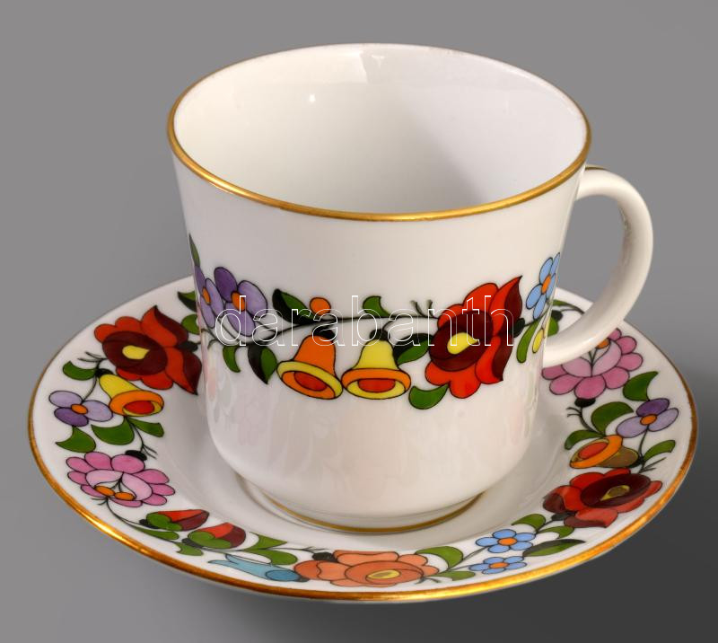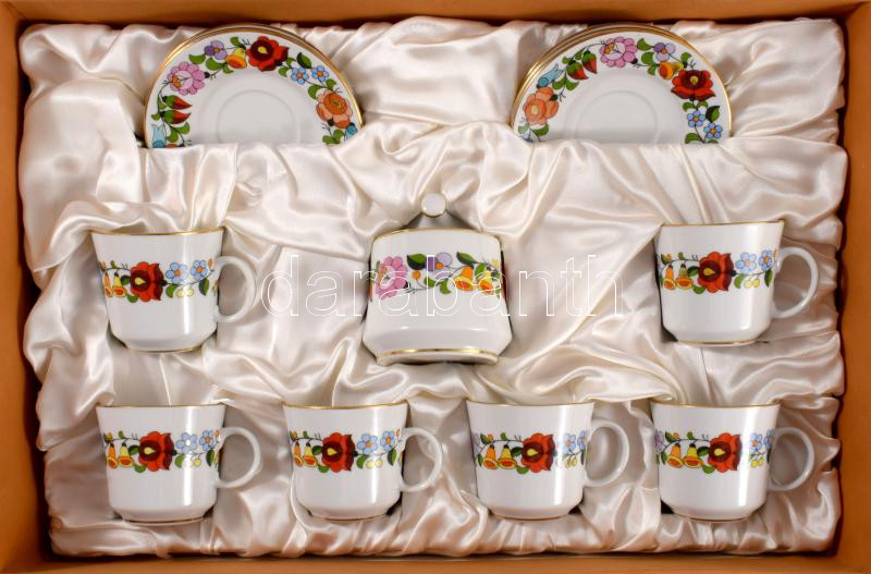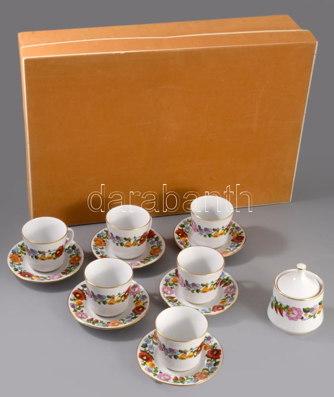 Leírás: Kalocsai Porcelán 6 személyes kávézó szett, 6 db csésze alátéttel és cukortartó, díszdobozban, hibátlan.