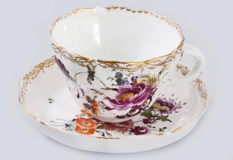 Leírás: Meissen antik kézzel festett teás csésze, aljjal, jelzett, aranyozáson kopással, csészén lepattanással, kardos jelzés, d: 15 cm