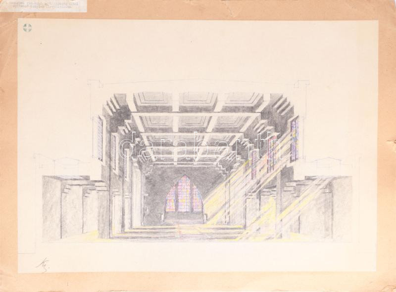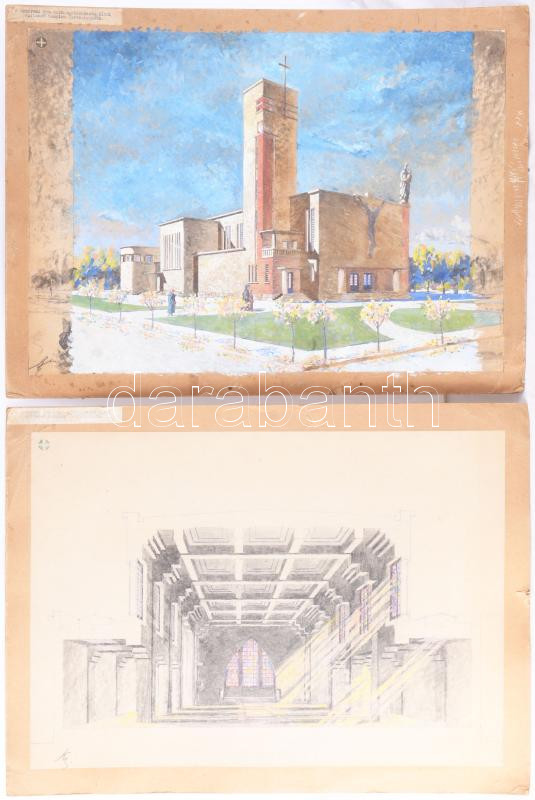 Jelzés nélkül, 2 db mű: Komároni római katolikus teplom tervei, 1930-35 körül. Vegyes technika, papír, kartonra kasírozva. Szélein kissé sérült. 35x49 cm.