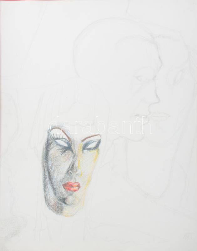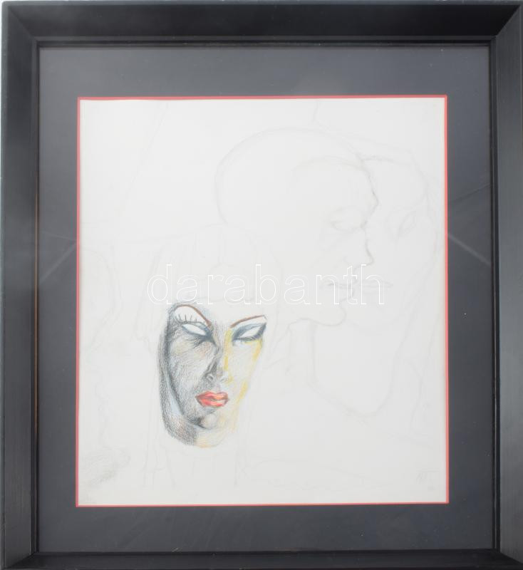 Leírás: MT jelzéssel: Arcok, ceruza, papír, üvegezett kerteben. 34x24 cm