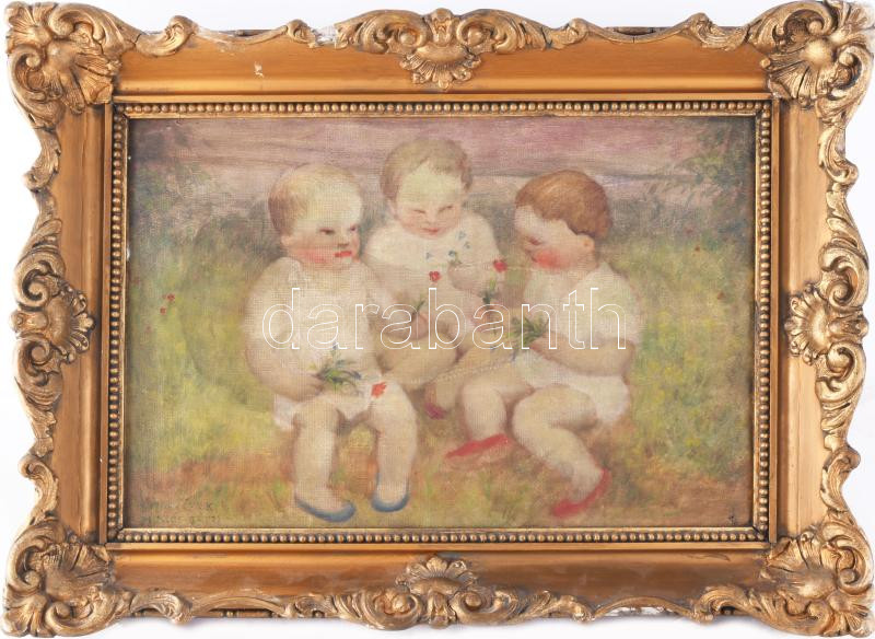 Leírás: Olvashatatlan jelzéssel, XX. sz. első fele: Virágszedő gyerekek. Olaj, vászon. Dekoratív, kissé sérült fakeretben. 28x41,5 cm