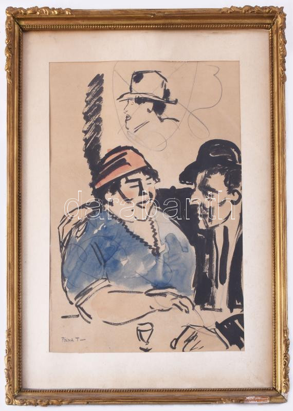 Leírás: Pólya T jelzéssel: Páros. Akvarell, tus, papír. Üvegezett, sérült fakeretben. 24×18 cm