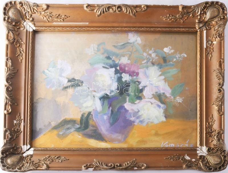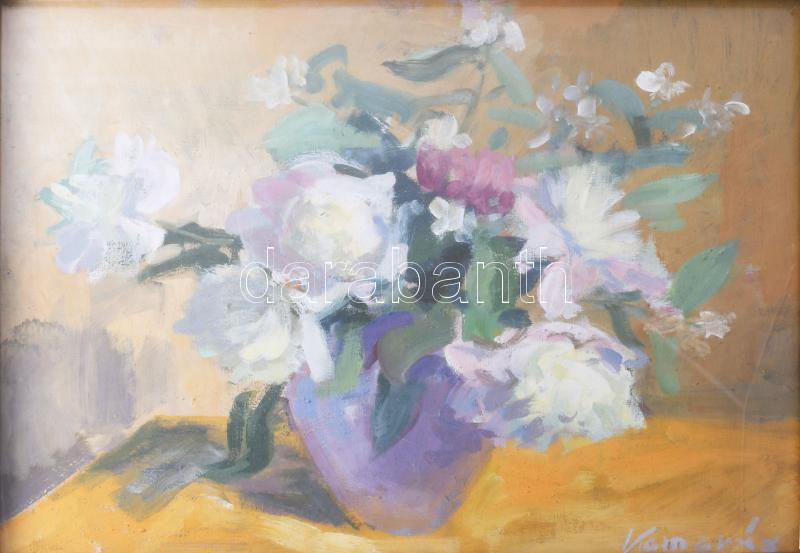 Kamarás Béla (működött a XX. sz. közepén): Csendélet. Olaj, vászon, jelzett. Hátoldalán Képzőművészeti Alap raglapjával. Dekoratív, üvegezett, sérült fakeretben. 40x50 cm