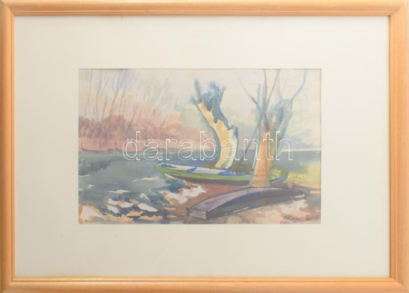 Leírás: Kőhegyi Gyula (1933-): Csónakok a mederben. Akvarell, papír. Jelzett, üvegezett keretben 32x35 cm