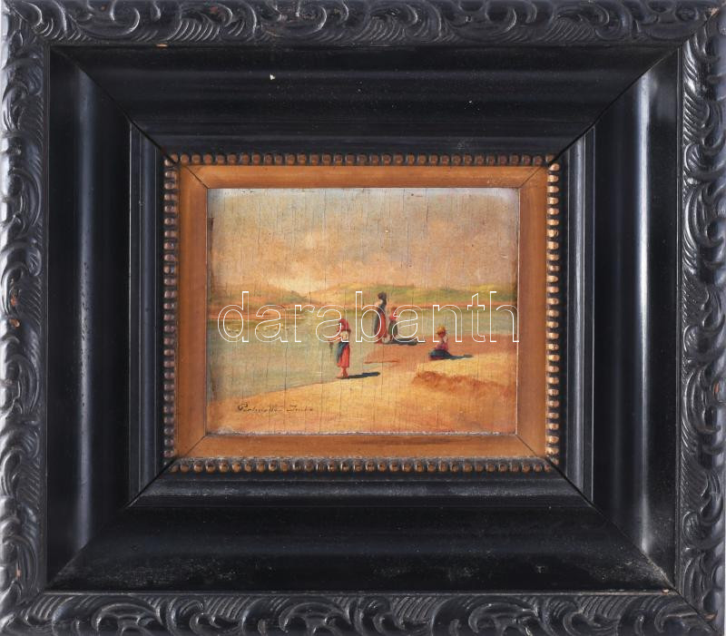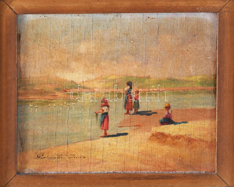 Leírás: Perlmutter Imre (1870 k.-1935): Vízparton. Olaj, fa, jelzett. Hátoldalán korabeli raglappal. Dekoratív fakeretben, 11,5x14,5 cm.